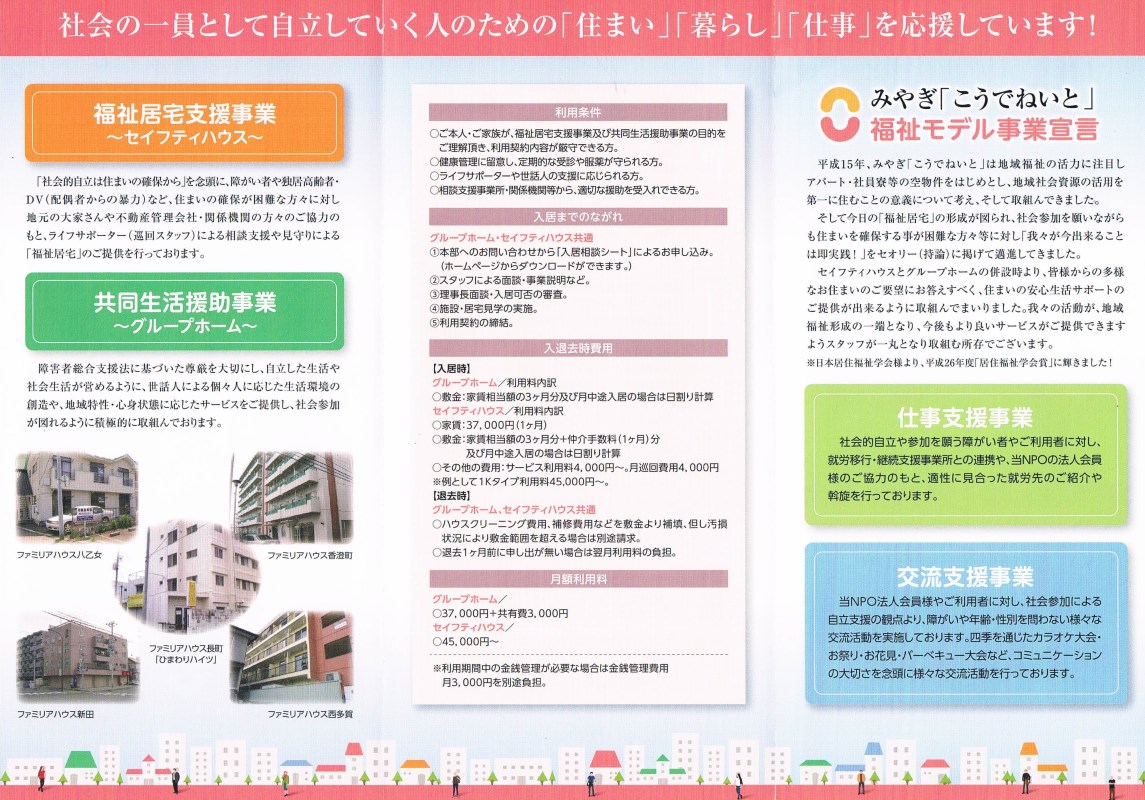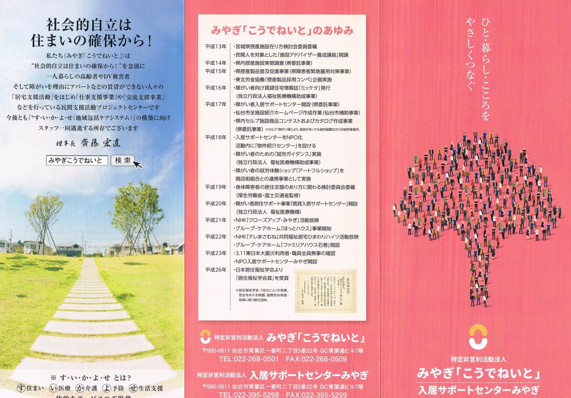 | 平成21年 | NPO入居サポートセンター設立 障害者のみならず高齢者 DV被害者 生活保護者 など通常のアパート契約が困難な人に対しての支援を開始 |